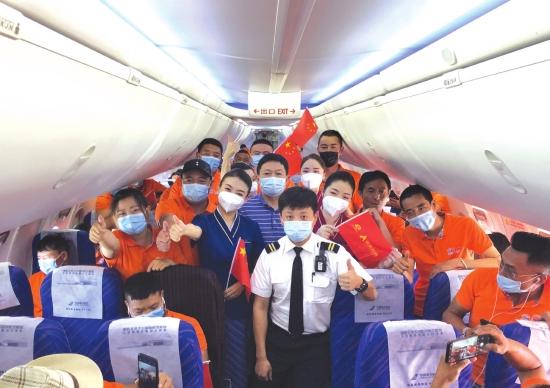 8 月 21 日,远赴格鲁吉亚的ag官方电子平台员工与空中乘务员一起合影。图 / 受访者提供